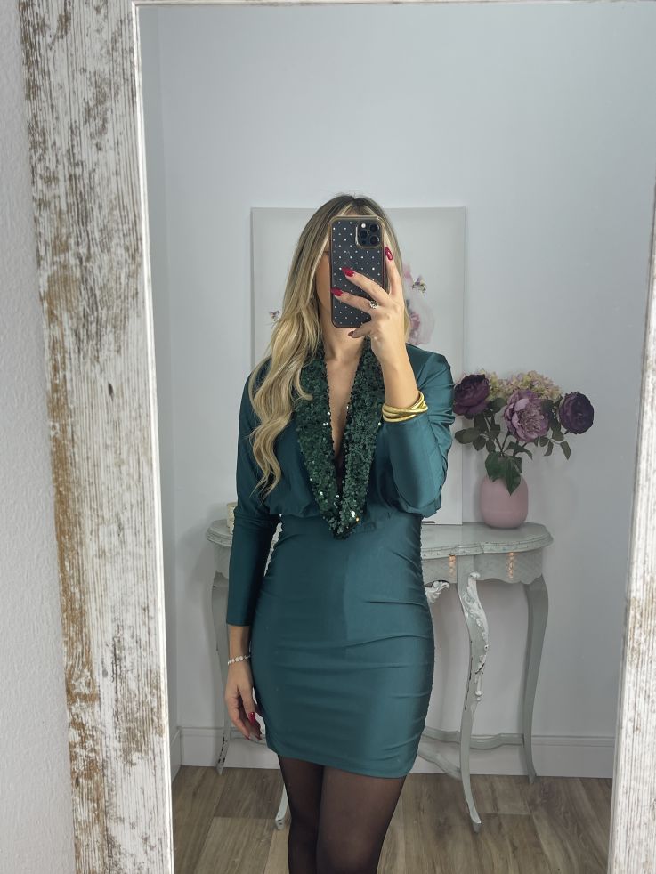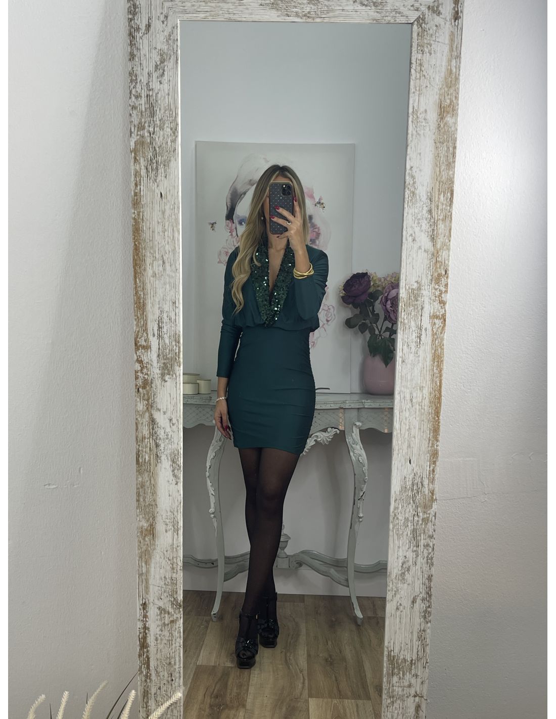 Vestido de corte ajustado de punto con solapa de lentejuelas. La zona del escote es cruzada y tiene corte debajo del pecho.