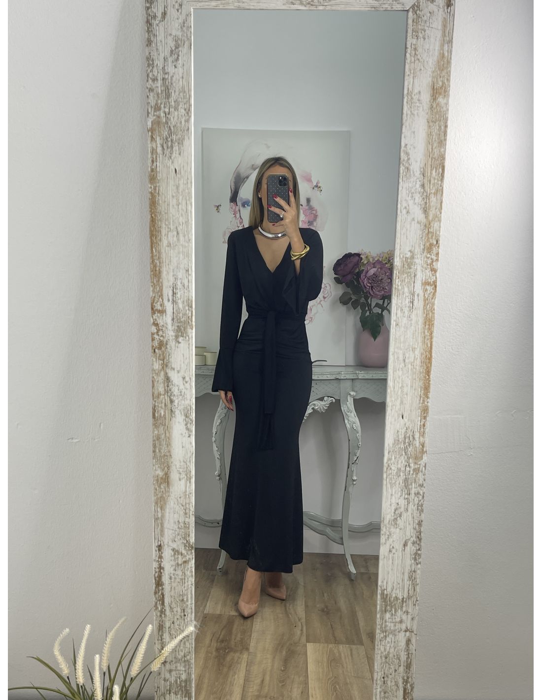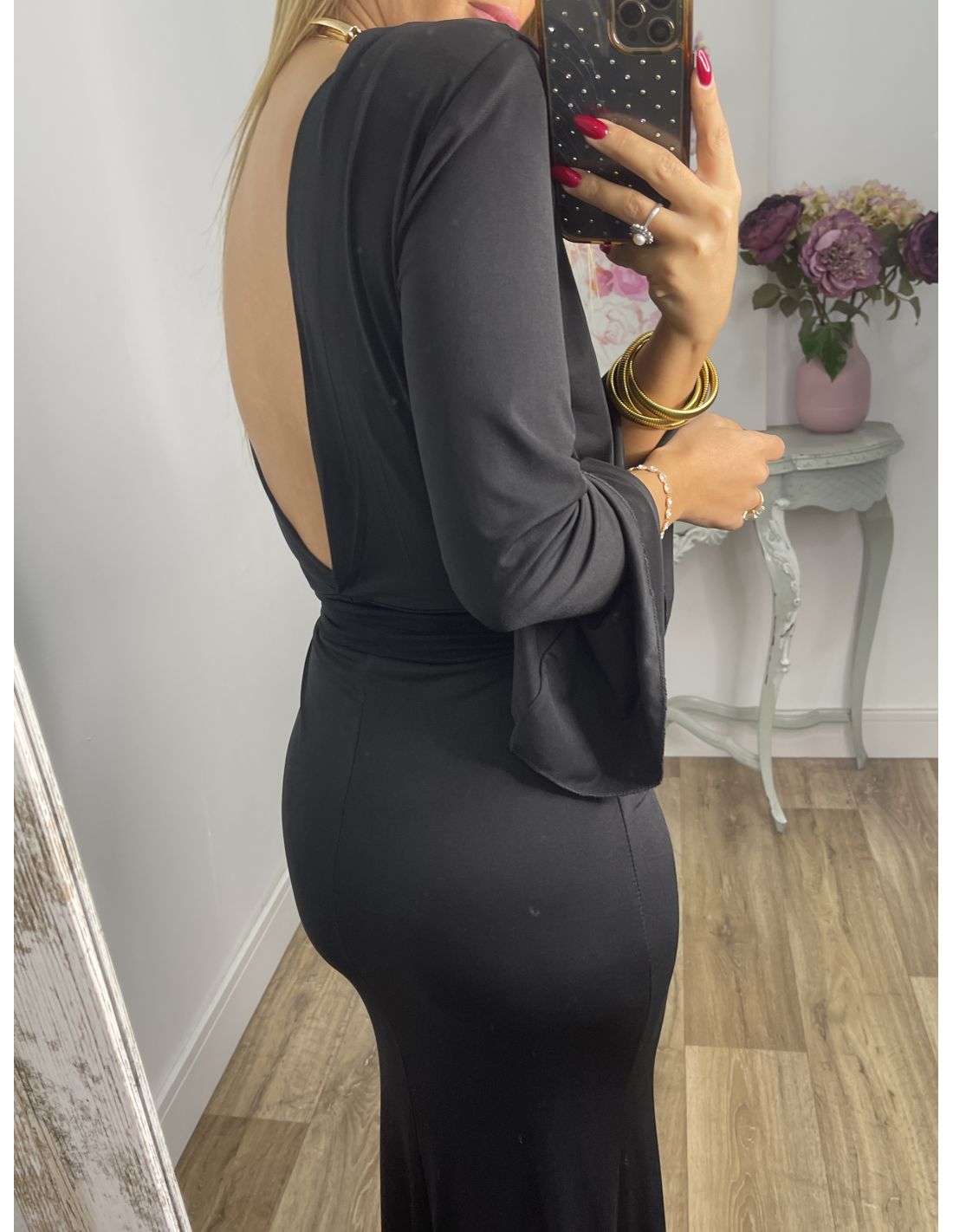 Vestido tejido. Con escote pronunciado tanto la parte delantera como en la parte de atrás. El corte del vestido es ajustado hasta la zona de la cadera que luego se abre. Trae cinturón del mismo tejido que se puede quitar y poner no lleva trabillas.