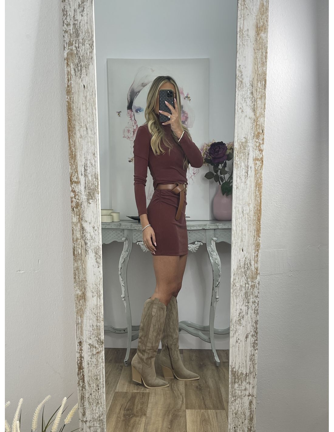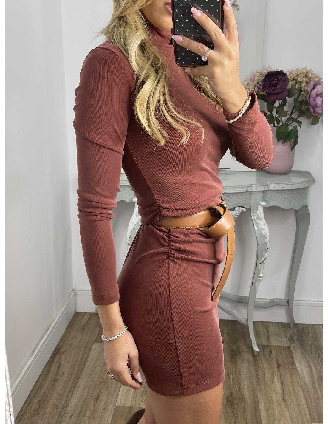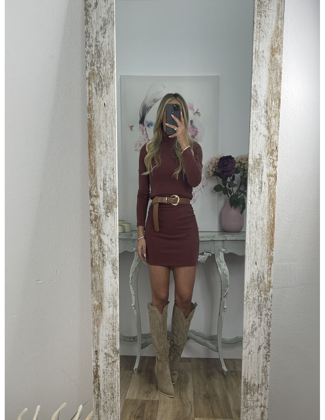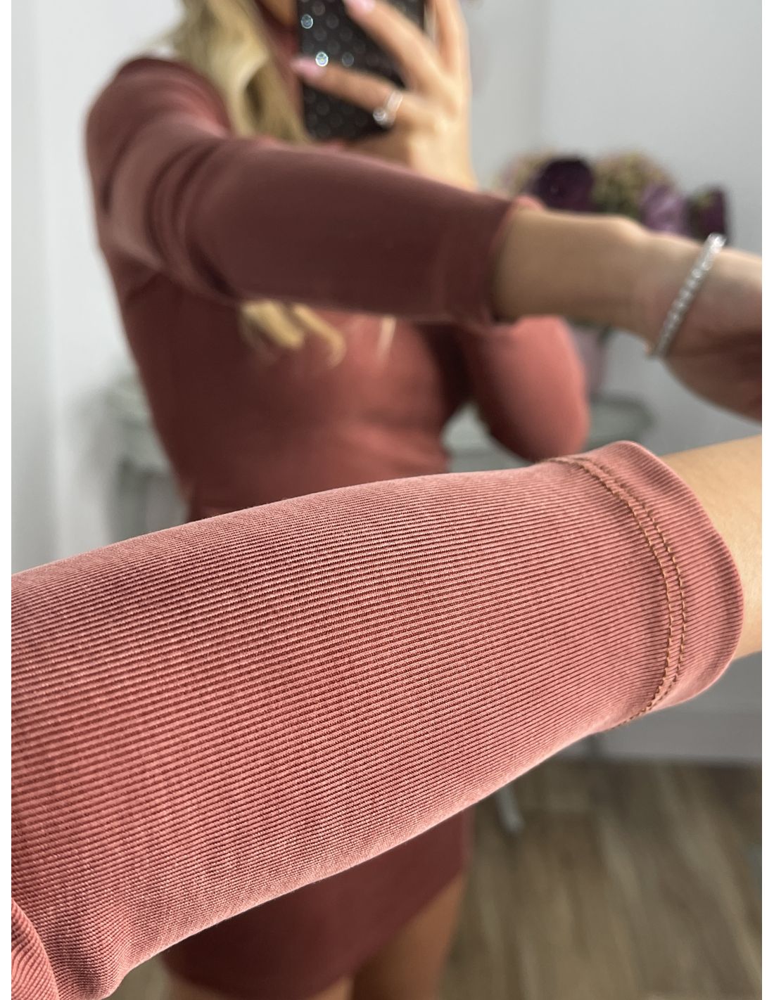 Vestido de punto con cuello perkins de corta ajustado y en la zona de la falda va un poquito fruncido en la costura lateral. El corte es ajustado. No se transparenta.