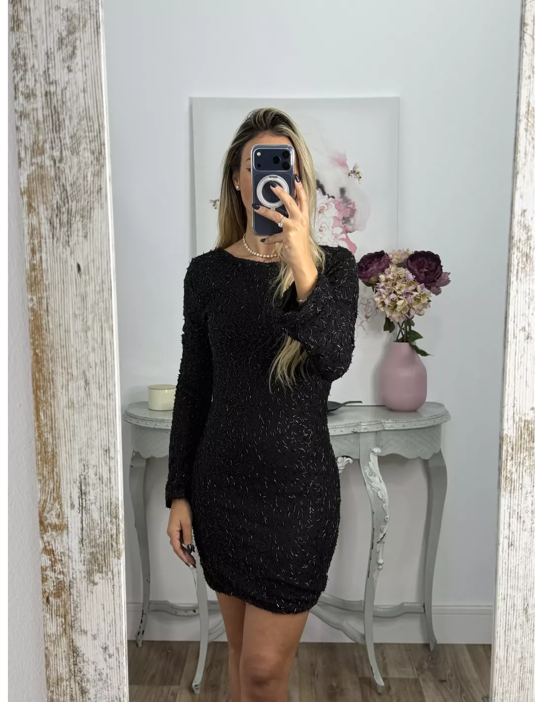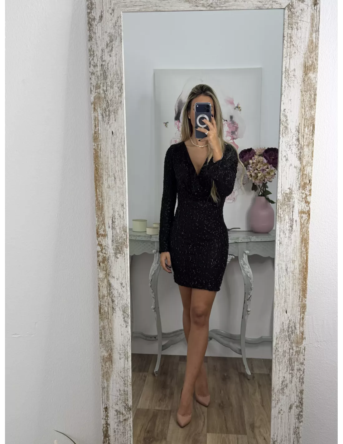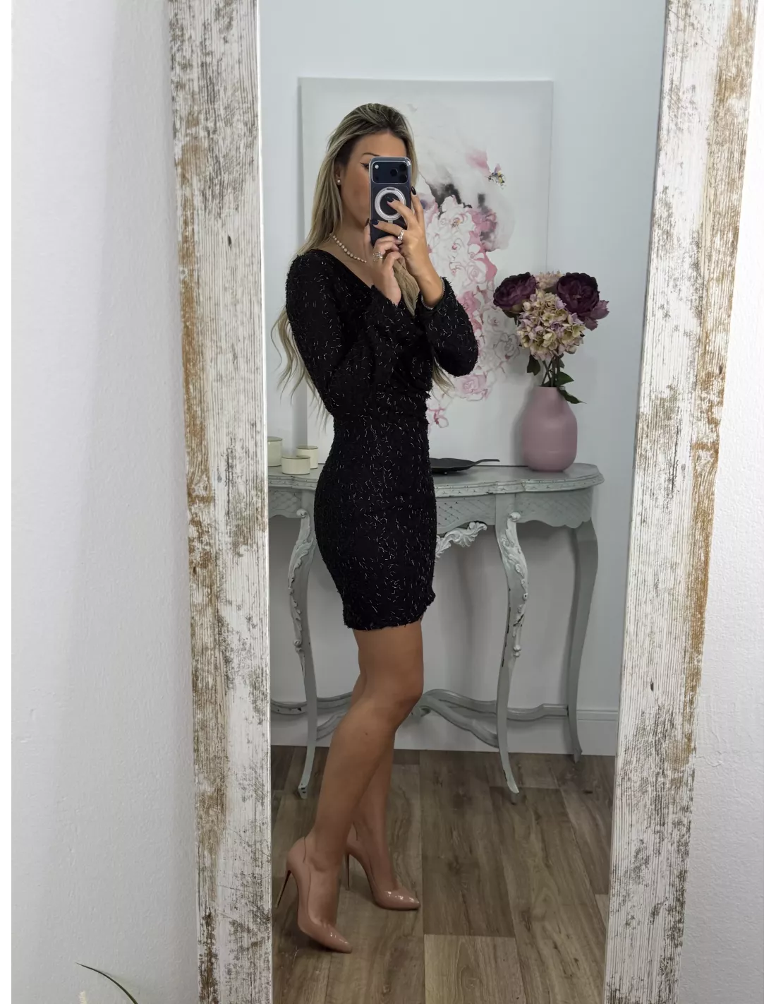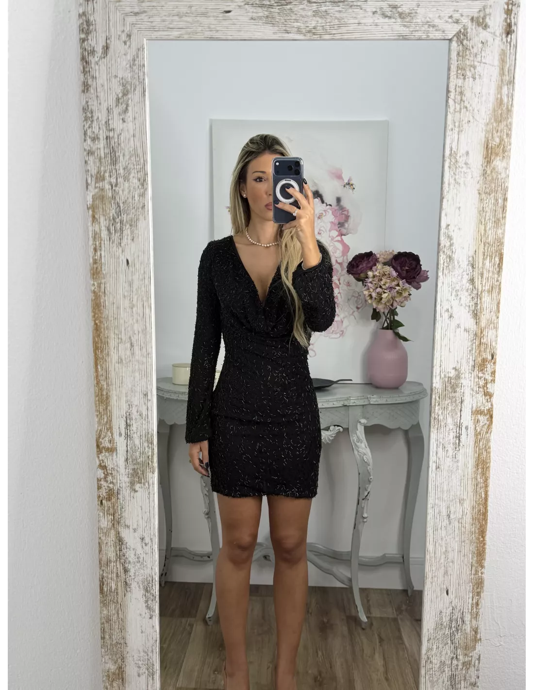 Vestido de lentejuelas. Va forrado, la lentejuela no está en contacto con la piel, no pica nada. Es de corte ajustado. El escote se puede poner hacia delante o hacia atrás.