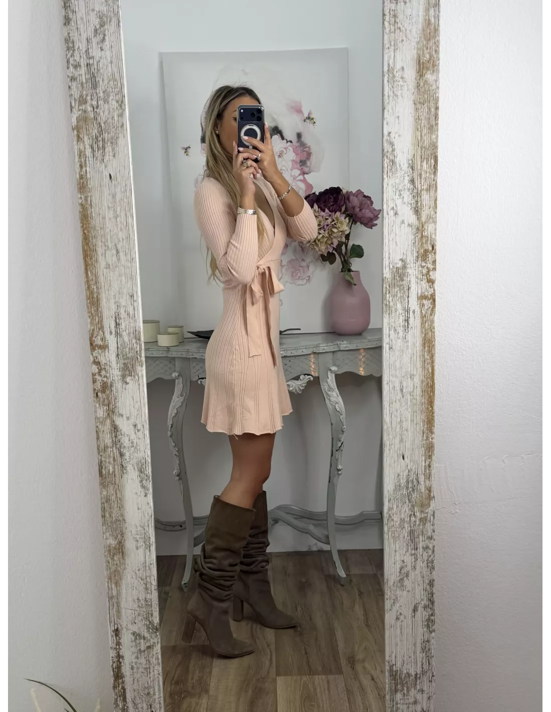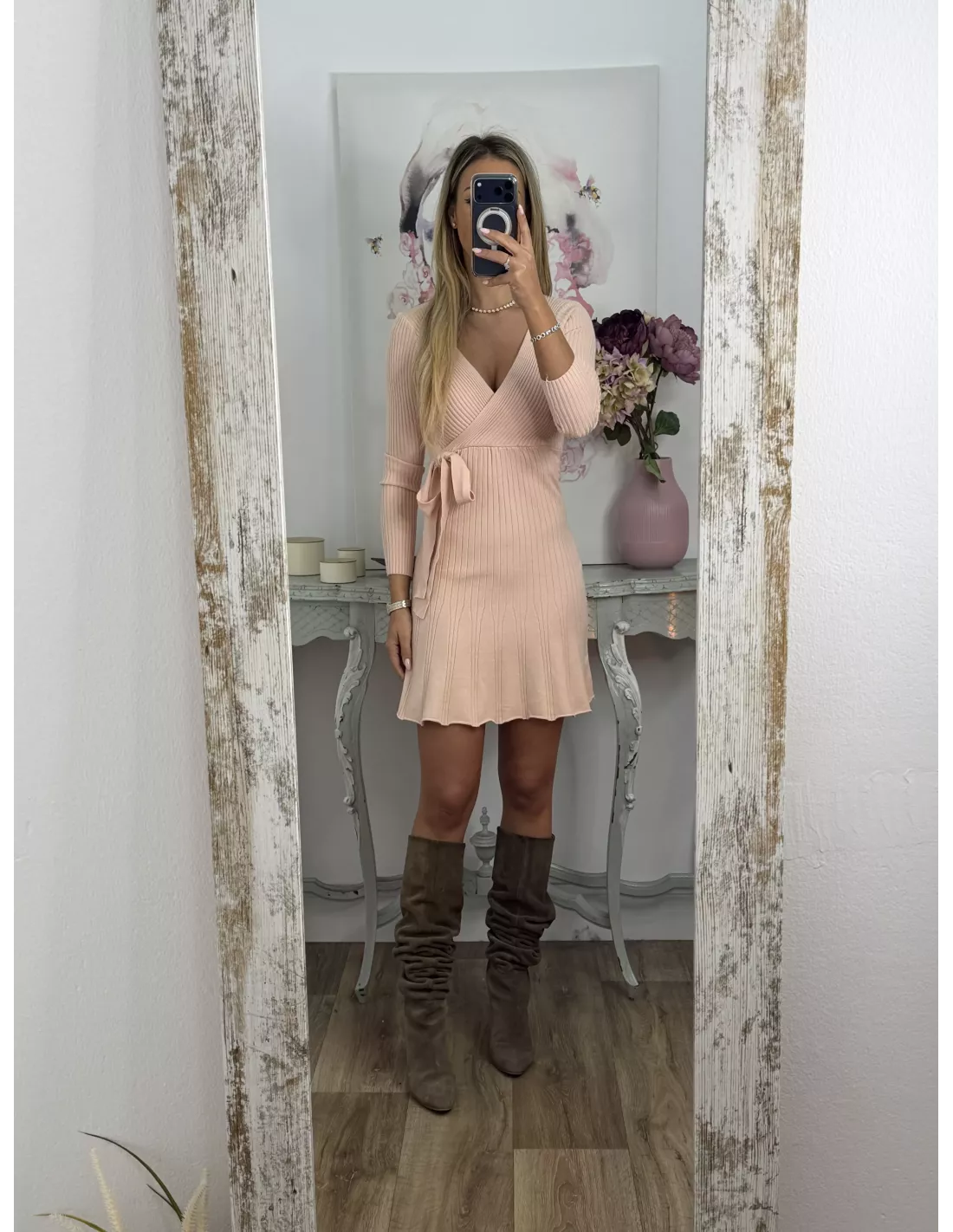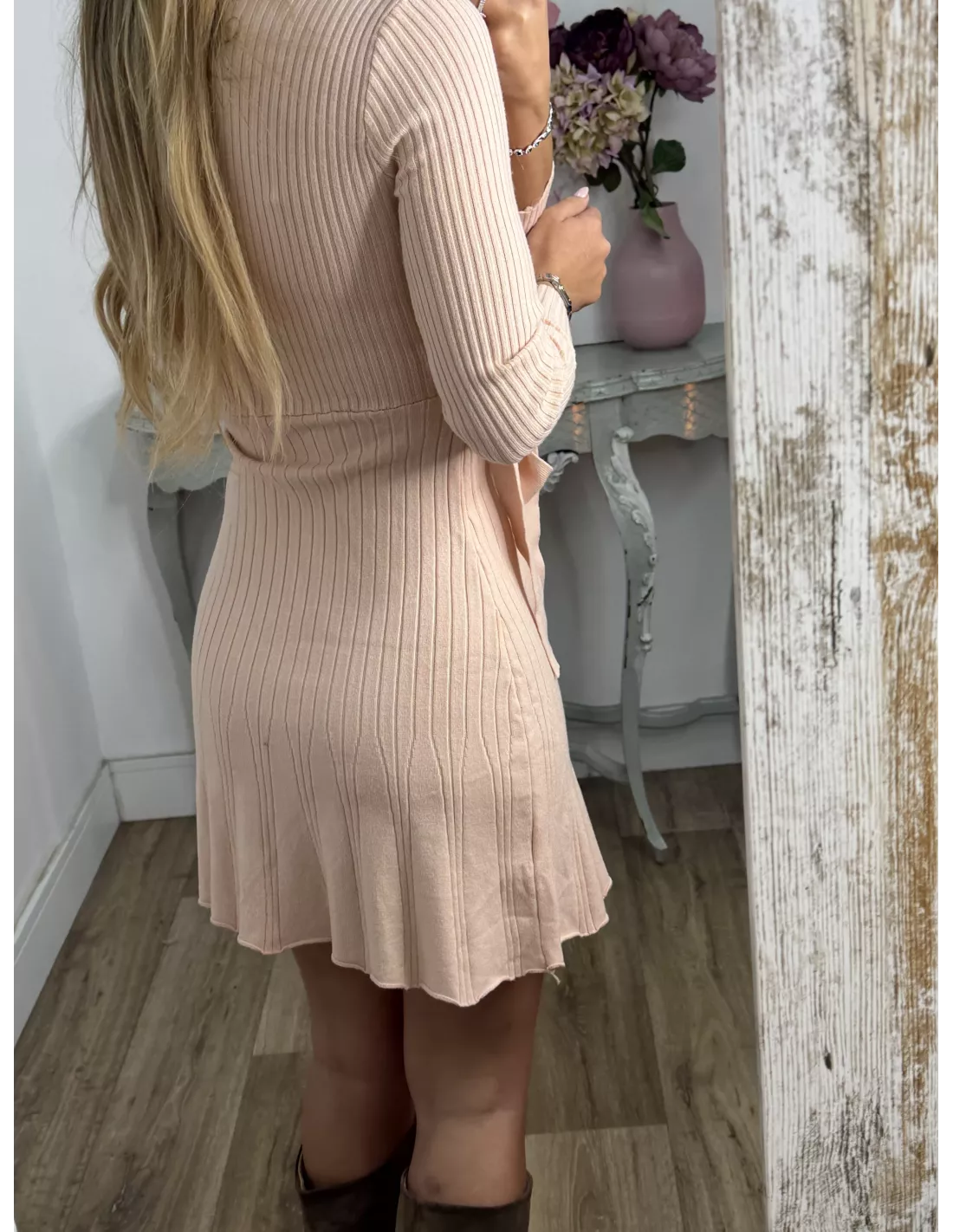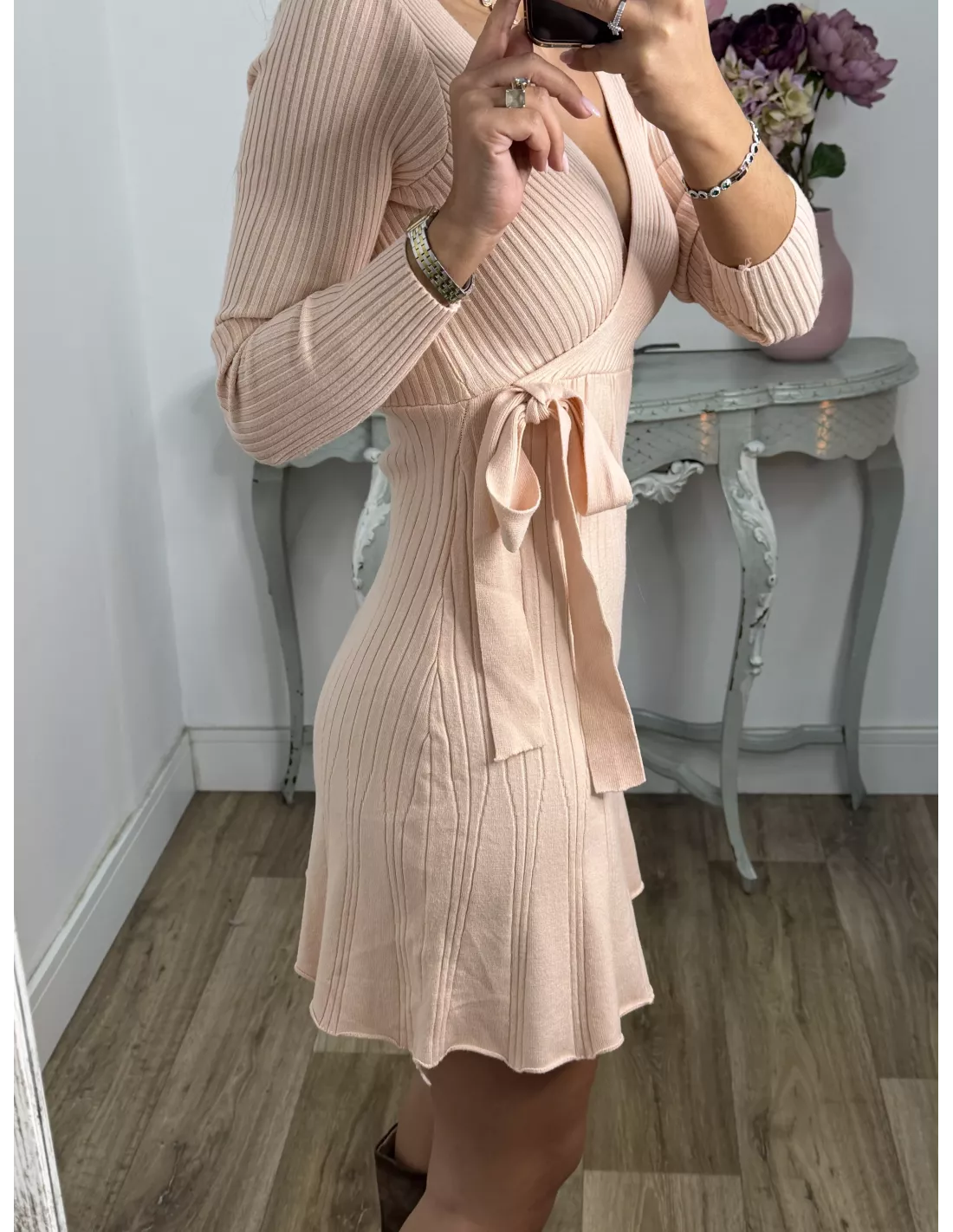 Vestido de punto con escote en pico cruzado.