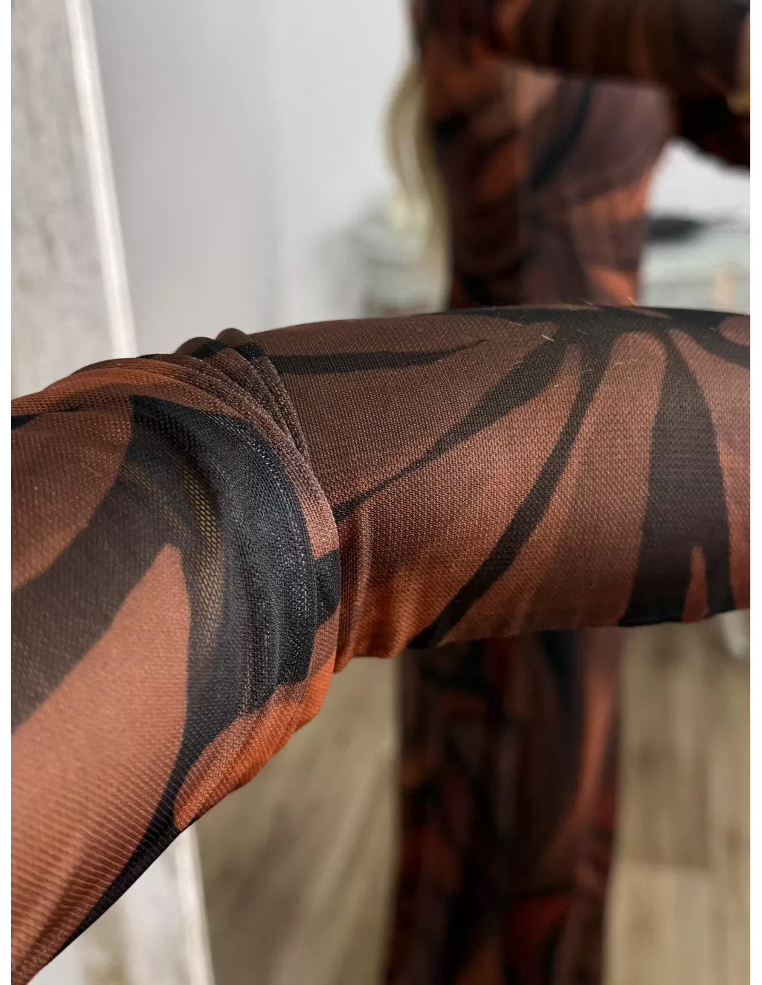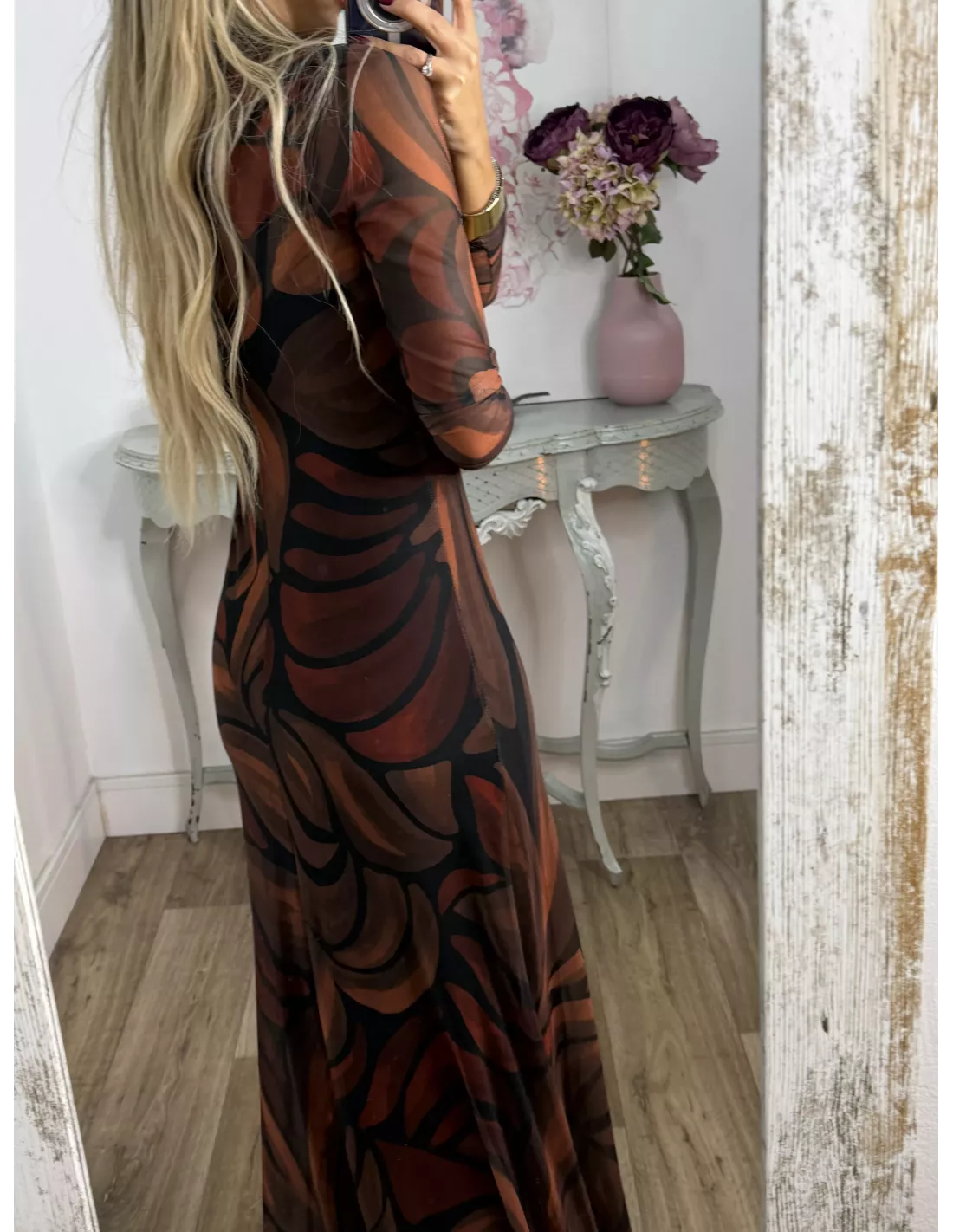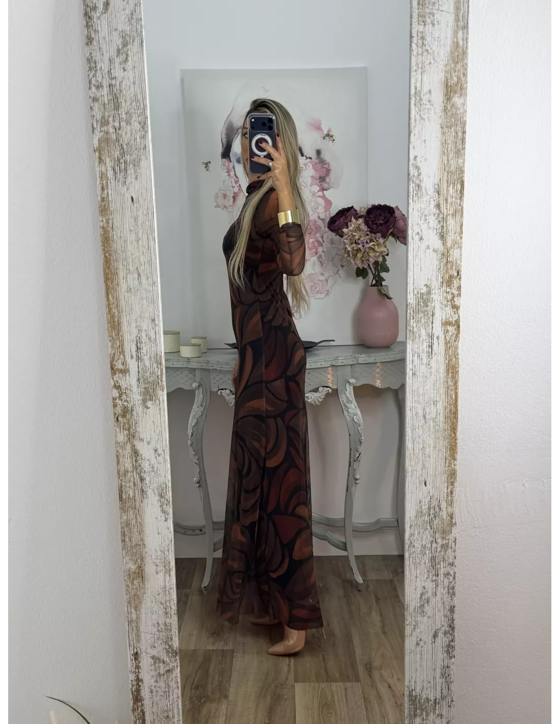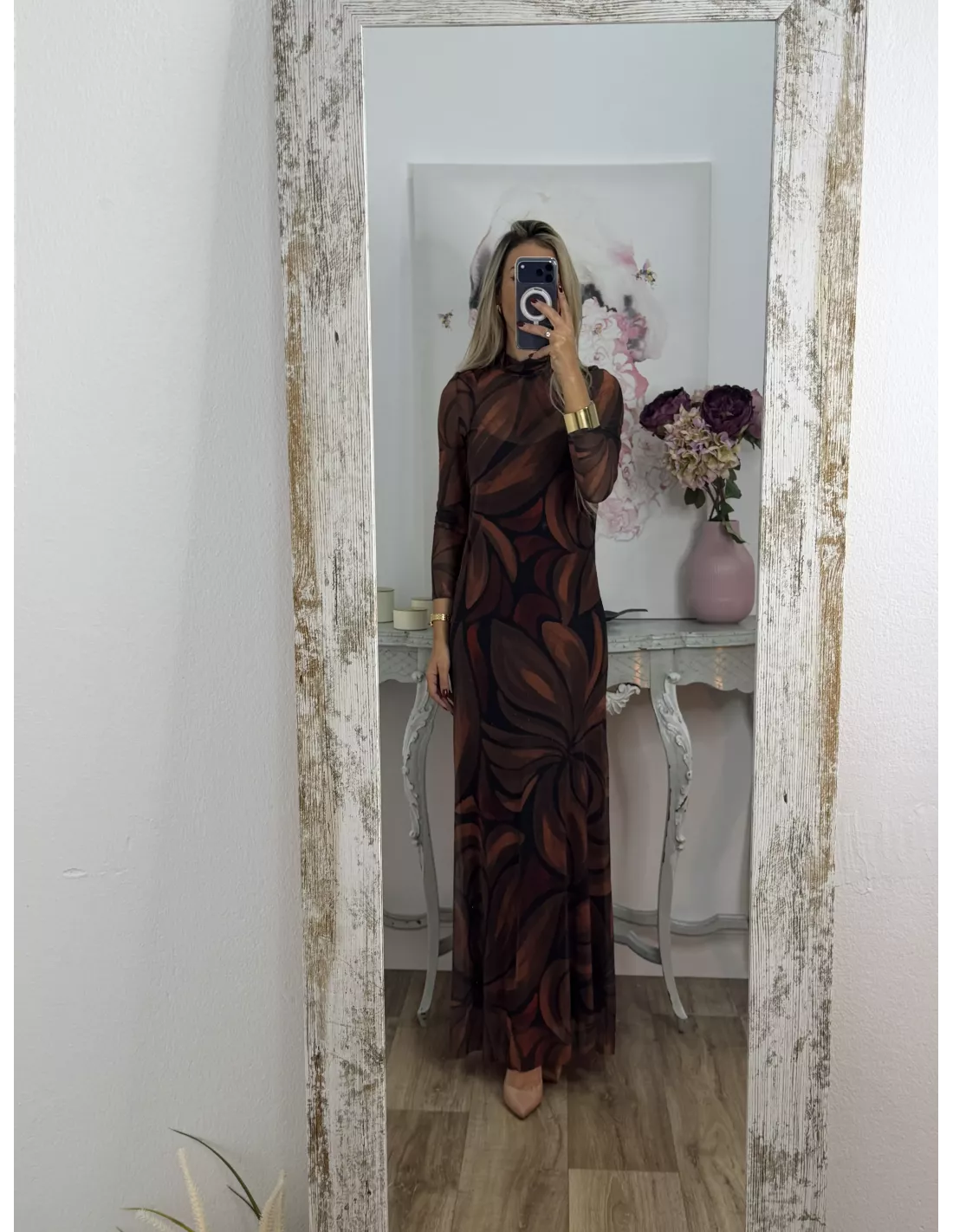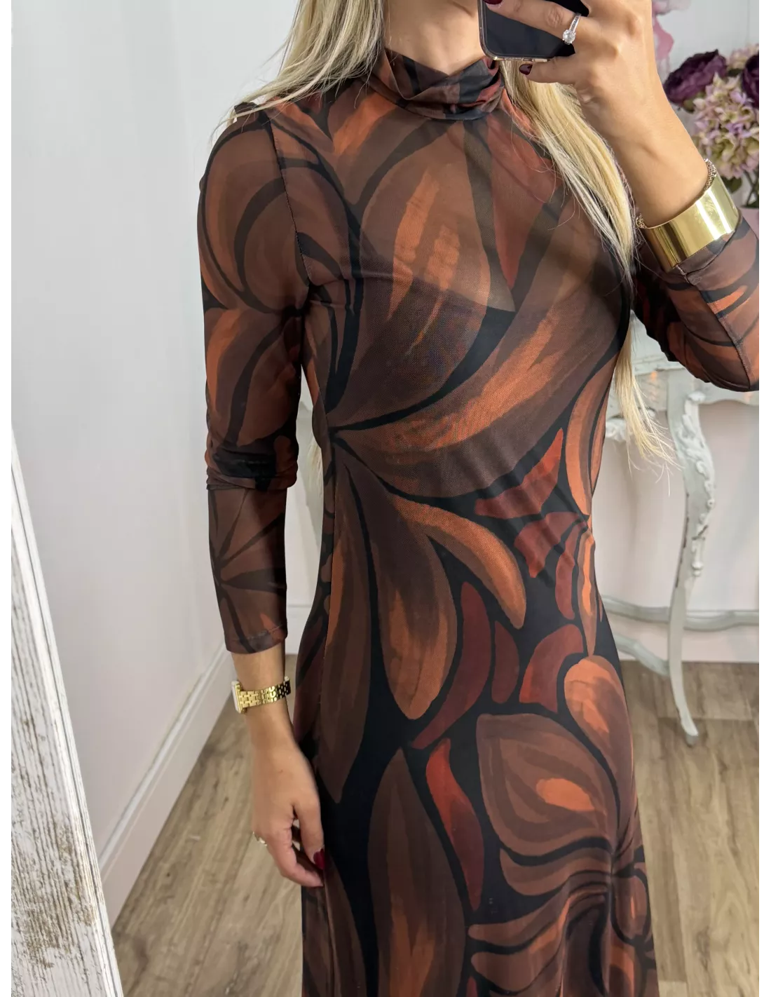 Vestido de punto de tul transparente con cuello Perkin. Es al cuerpo hasta la zona de la cadera que luego se abre. Debajo lleva otro vestido que hace de forro en color negro, que es de algodón.