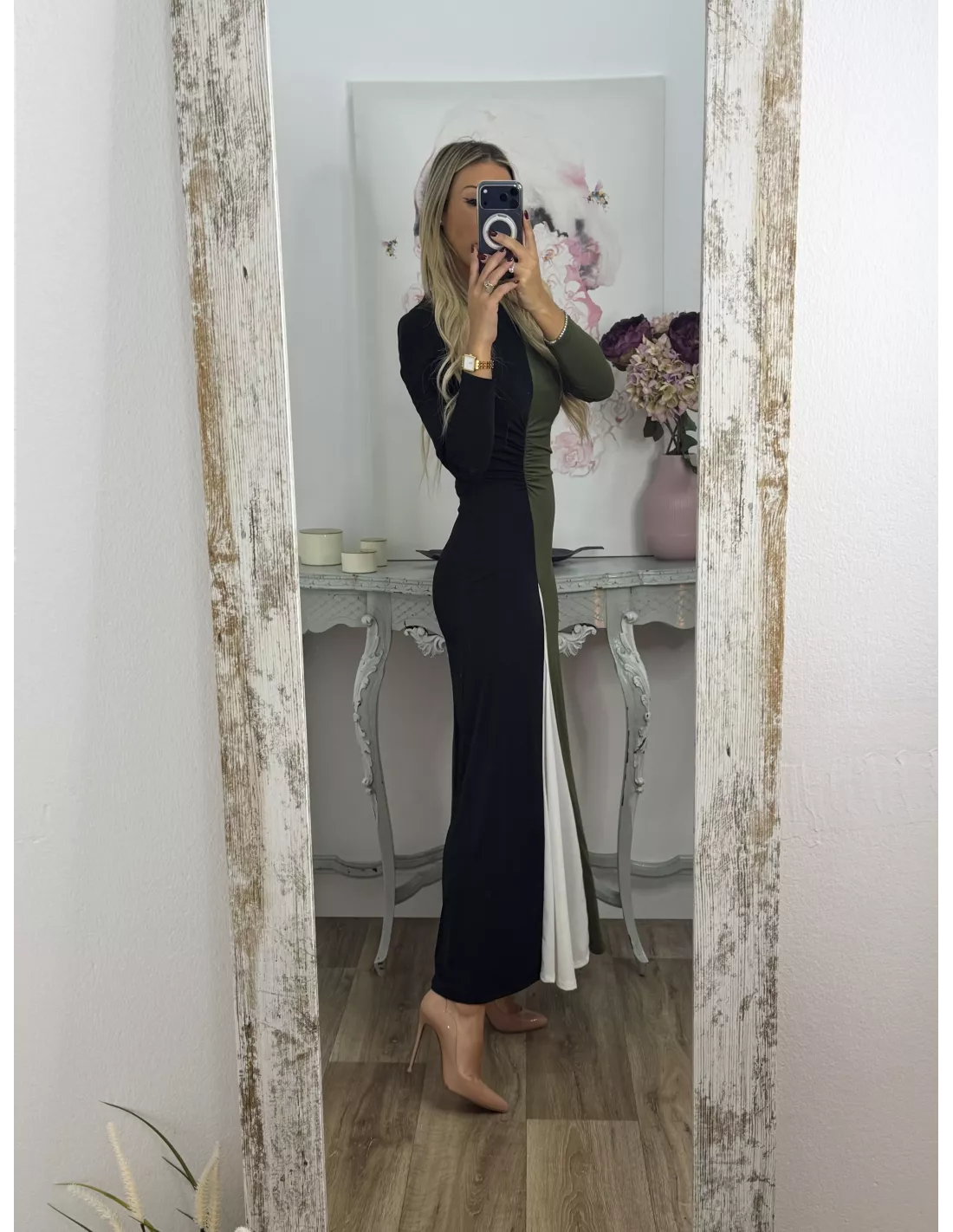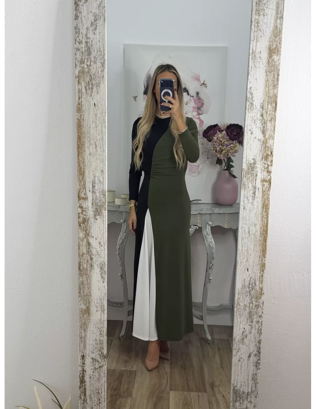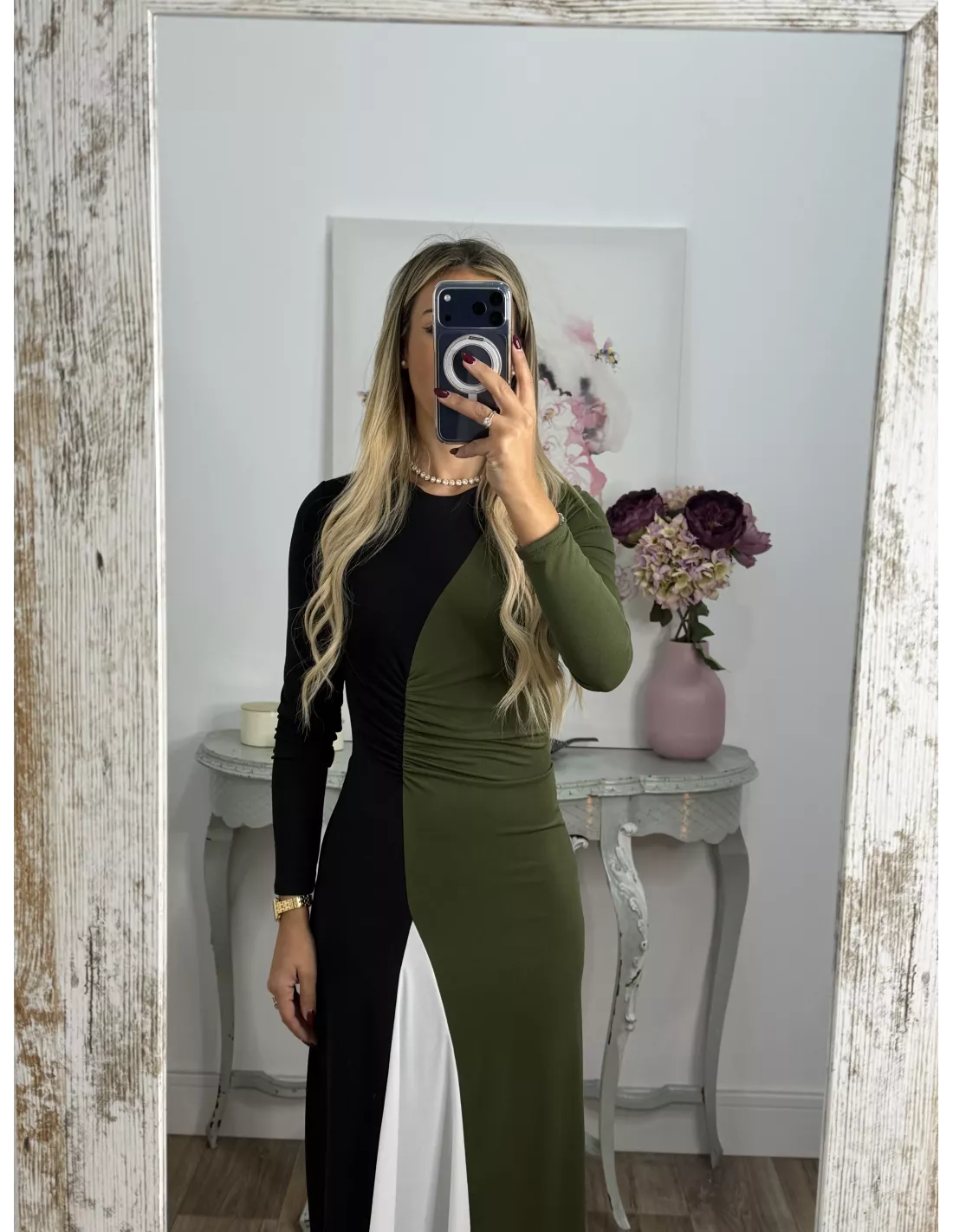 Vestido de punto tricolor. Es de cuello, la caja de corta ajustada hasta la zona de la cadera y luego se abre. La parte de arriba está la mitad del muslo va forrada del mismo tejido de punto.
