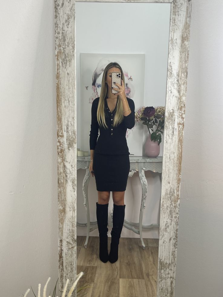 Vestido de punto con cuello tipo polo y botones en la zona del pecho. El corte es ajustado.