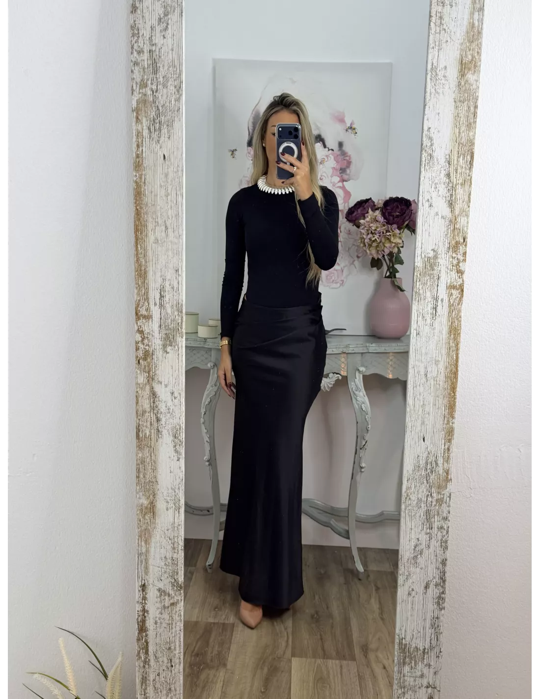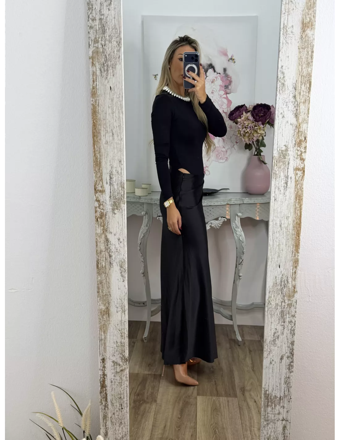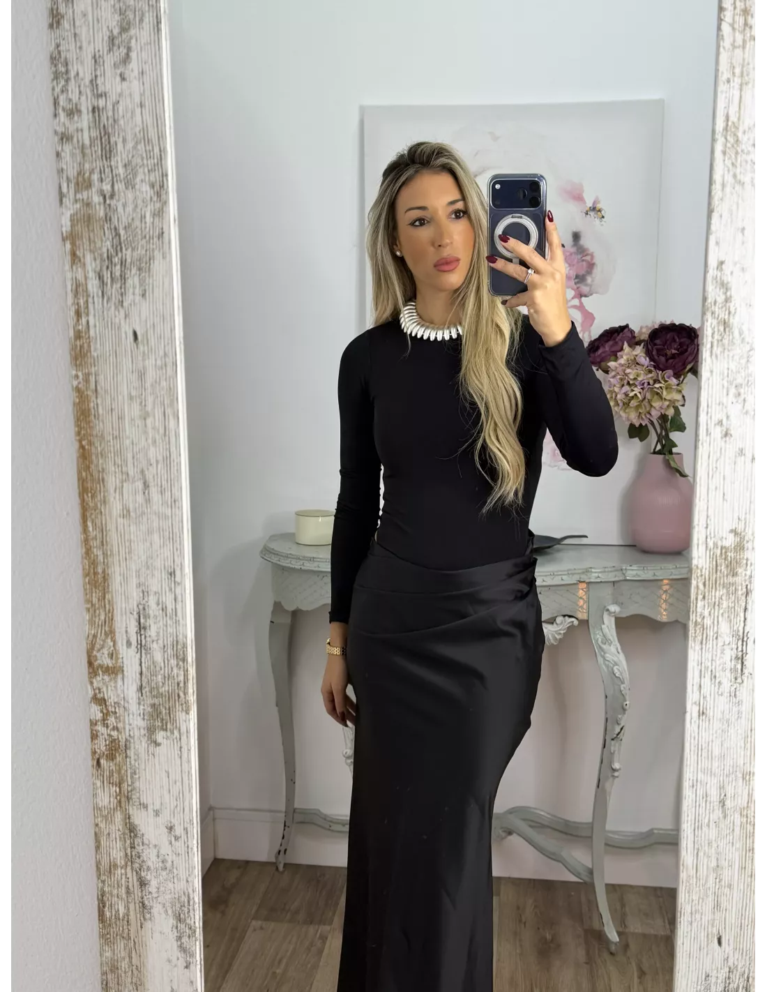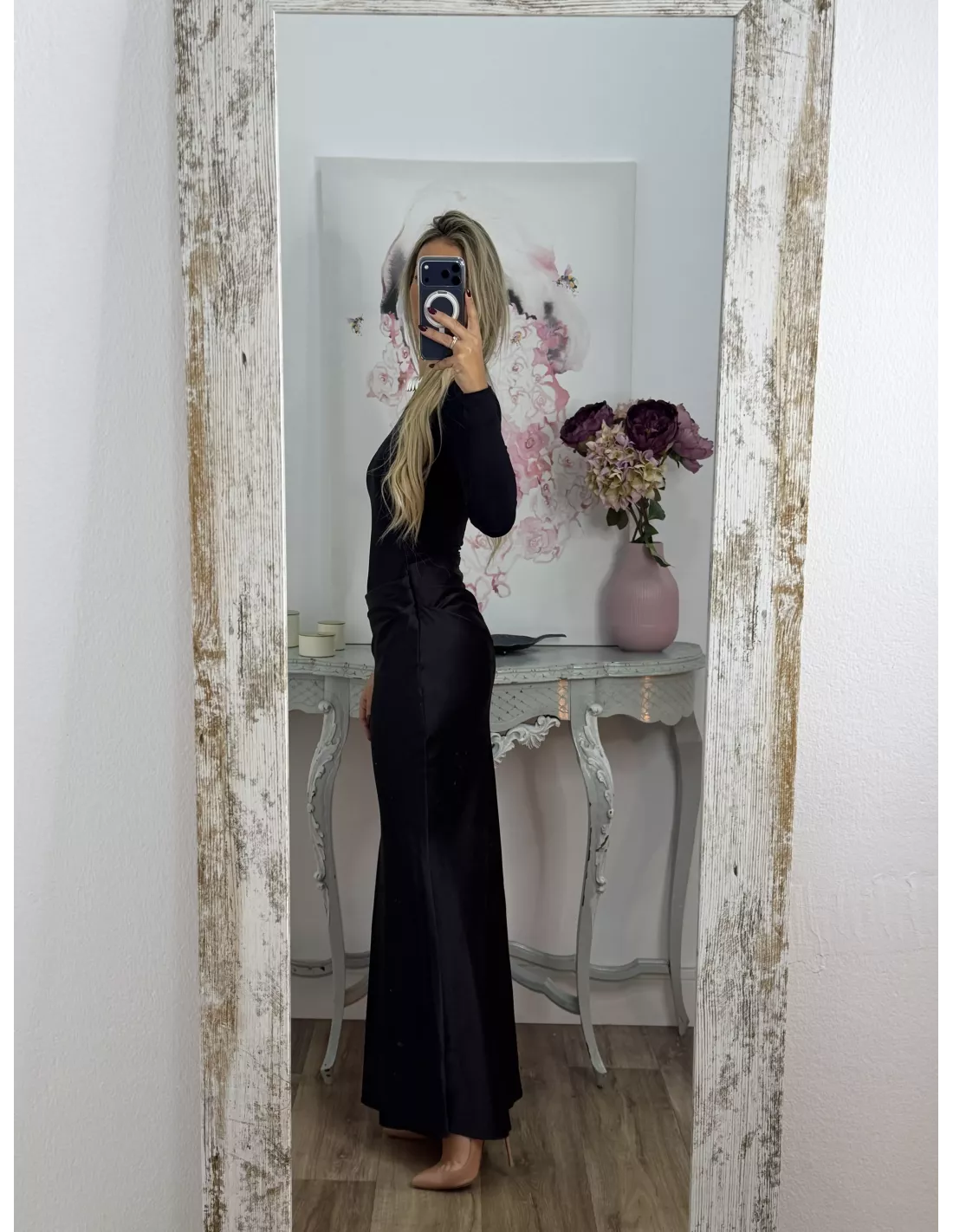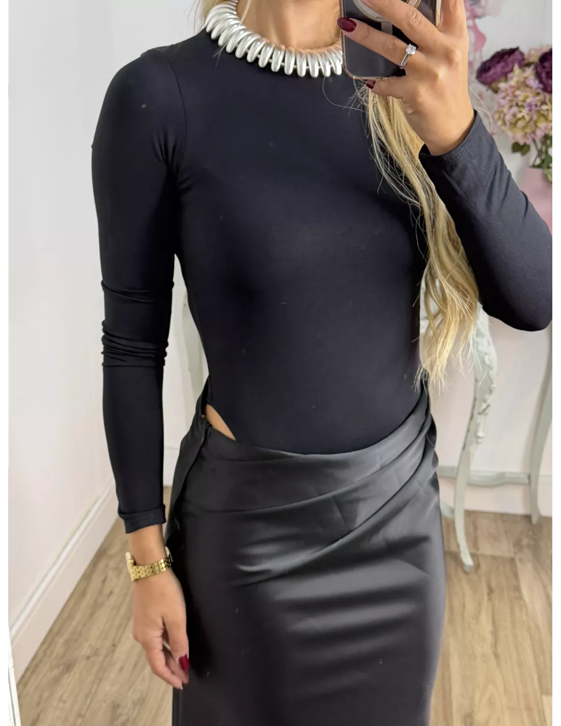 Vestido que combina dos tipos de tejido. La parte arriba es un Body de licra de cuello. La caja y ajustado y la zona de la falda es tejido tipo raso que se cierra con una cremallera invisible en el lateral. Lleva una abertura en la zona de la cintura.