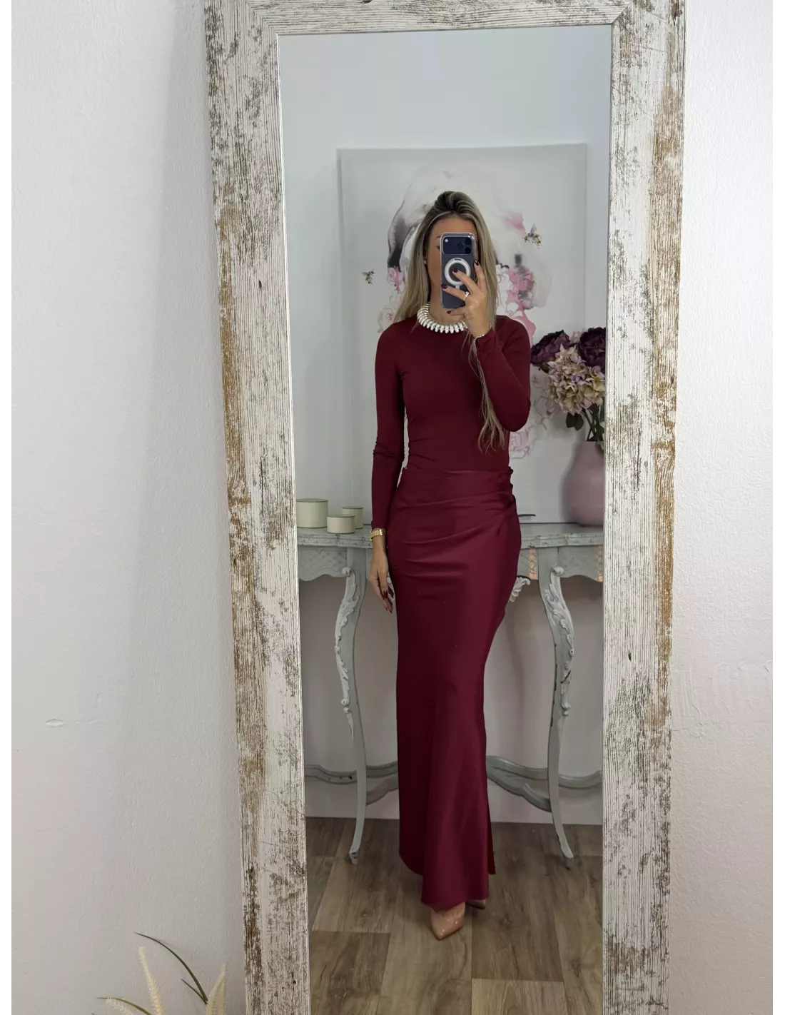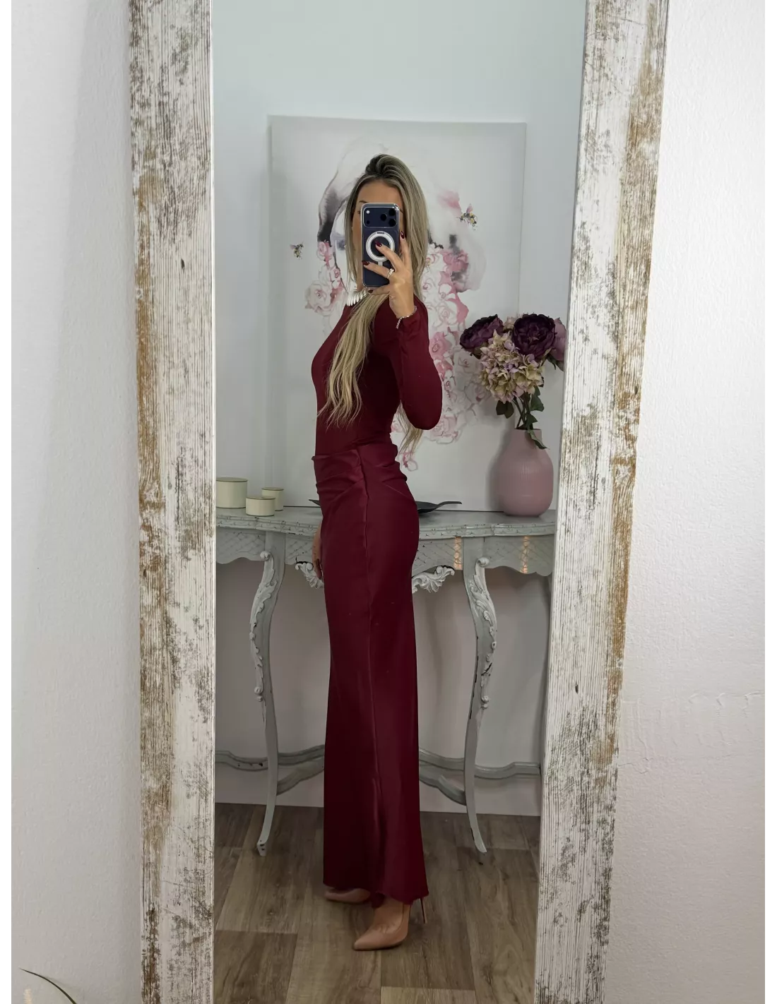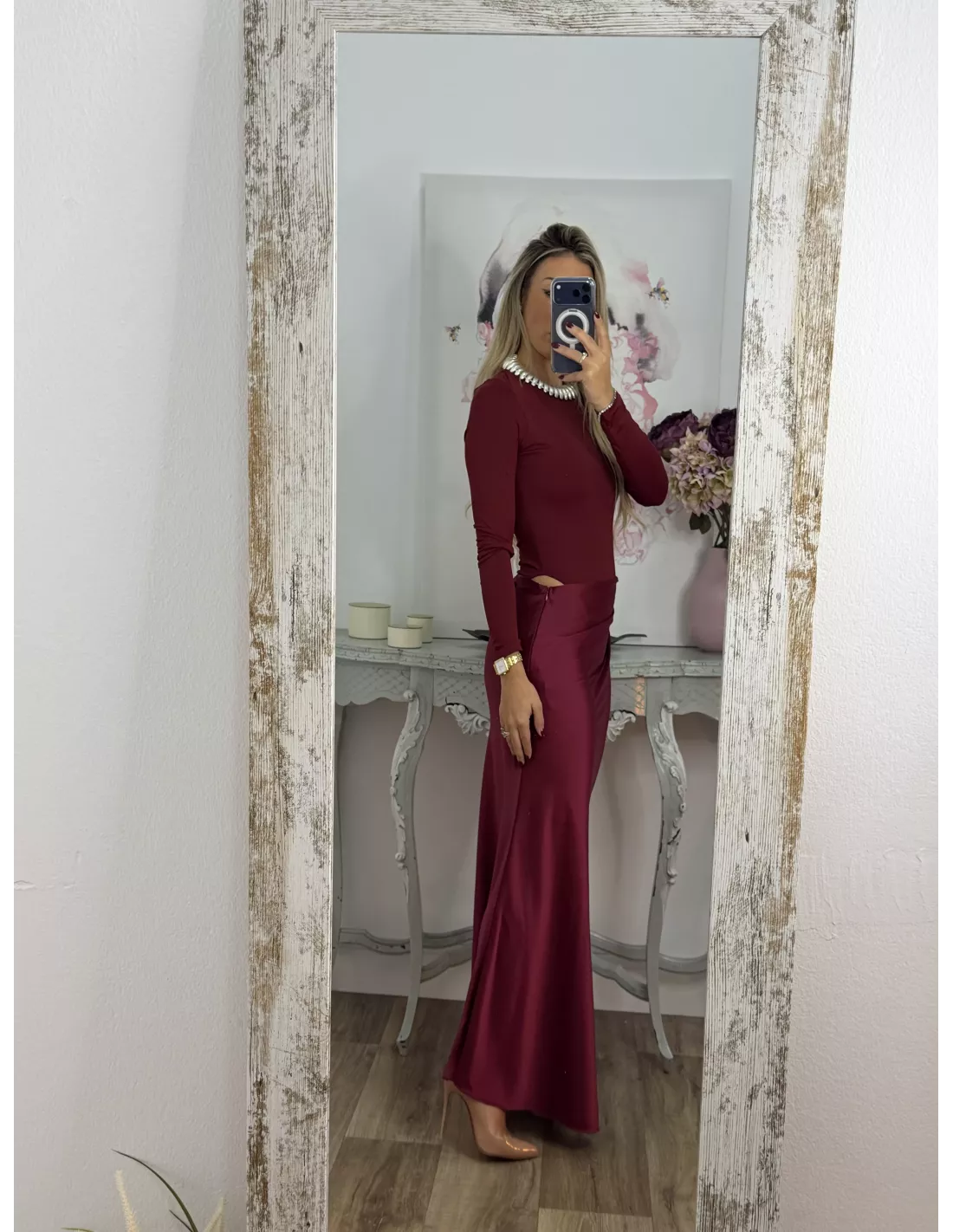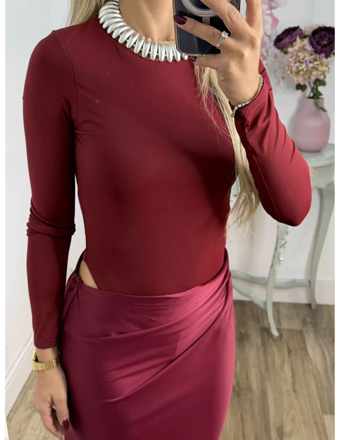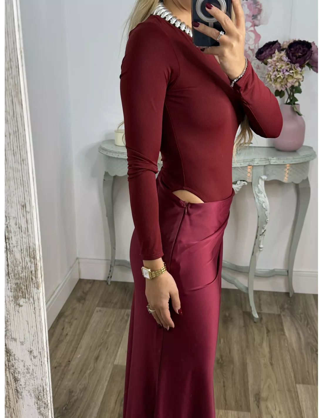 Vestido que combina dos tipos de tejido. La parte arriba es un Body de licra de cuello. La caja y ajustado y la zona de la falda es tejido tipo raso que se cierra con una cremallera invisible en el lateral. Lleva una abertura en la zona de la cintura.